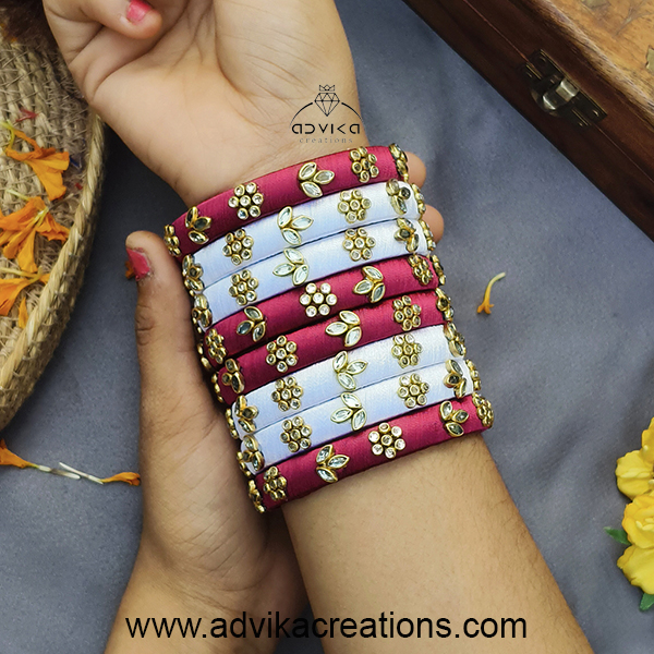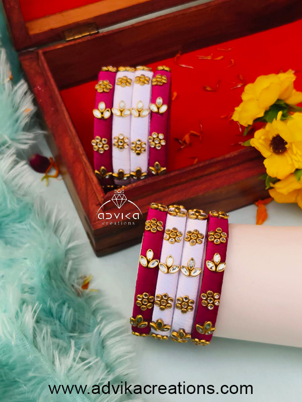 Add a pop of elegance to your festive or wedding look with this exquisite bangle set. These bangles are meticulously wrapped in soft white and vibrant magenta silk threads, creating a stunning dual-tone contrast that instantly catches the eye. Each bangle is adorned with sparkling Kundan stones, delicately placed to enhance the richness and traditional charm of the design.