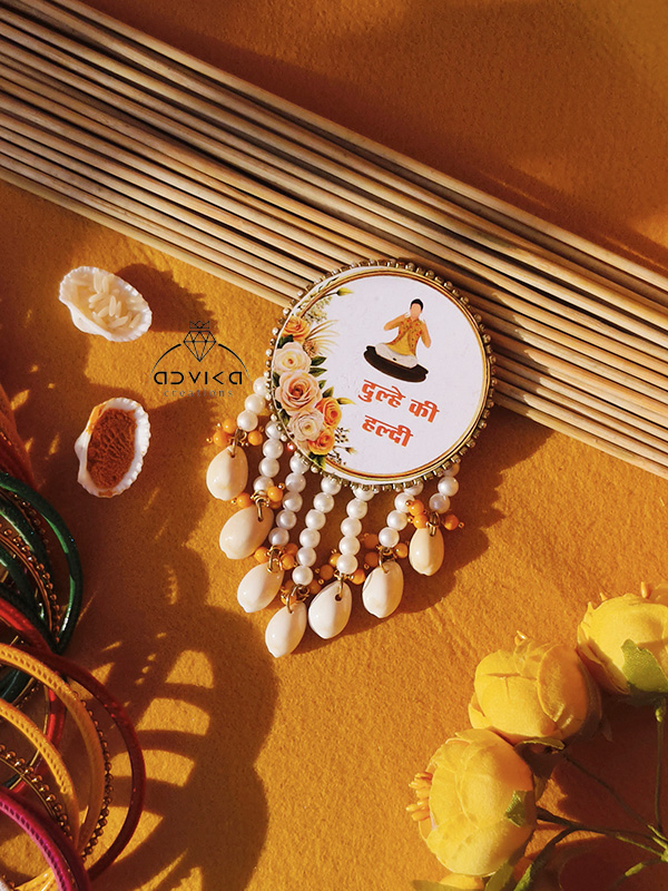 Make the groom's Haldi ceremony unforgettable with this vibrant, handcrafted lapel pin. Featuring the Hindi text "Dulhe Ki Haldi" (Groom's Haldi), this brooch is designed to capture the joyous spirit of Indian weddings.