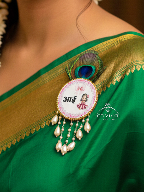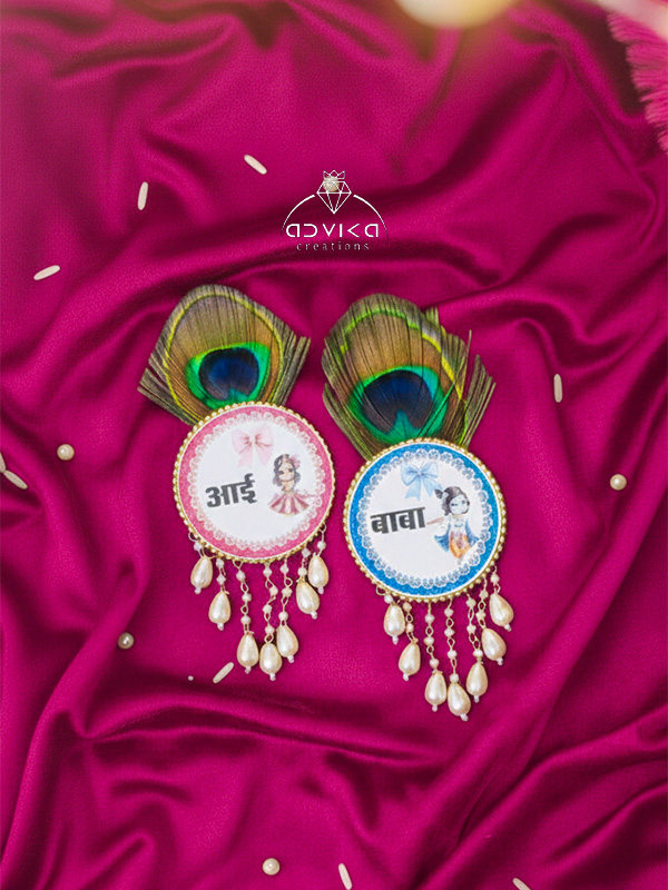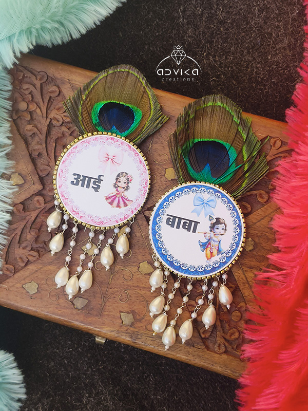 Celebrate love, blessings, and divine grace with this beautifully handcrafted Aai - Baba Baby Shower Brooch, designed in an adorable Radha Krishna kid print. Thoughtfully curated for baby shower and godh bharai ceremonies, this brooch blends traditional symbolism with delicate detailing, making it a meaningful accessory for the parents-to-be.