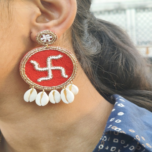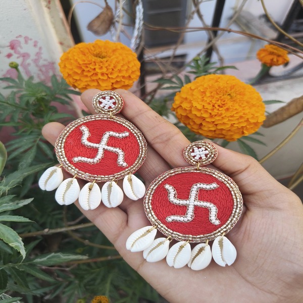 These earrings feature a bold and intricate Swastik design, crafted from bright red beads, symbolizing prosperity, good fortune, and positive energy. The red beads add warmth and richness to the earrings, while the Swastik motif invokes deep cultural and spiritual significance.