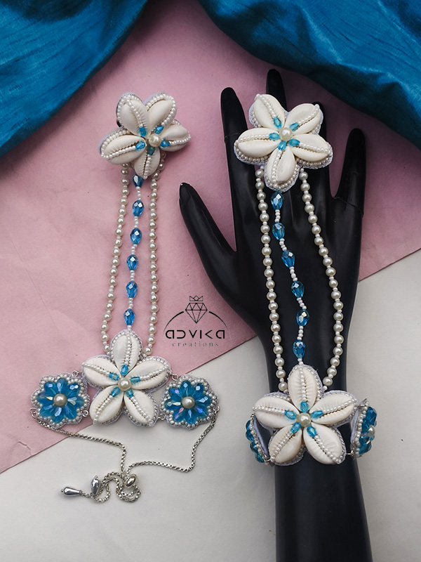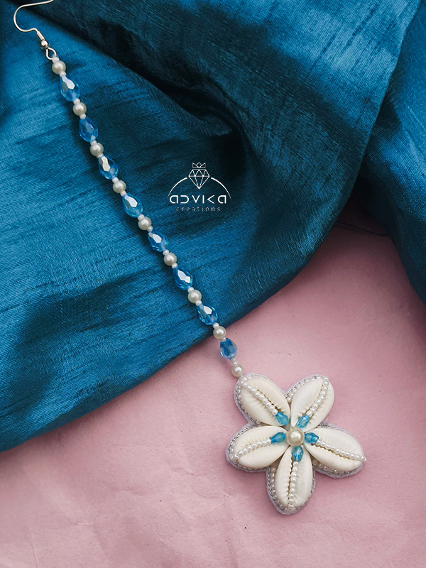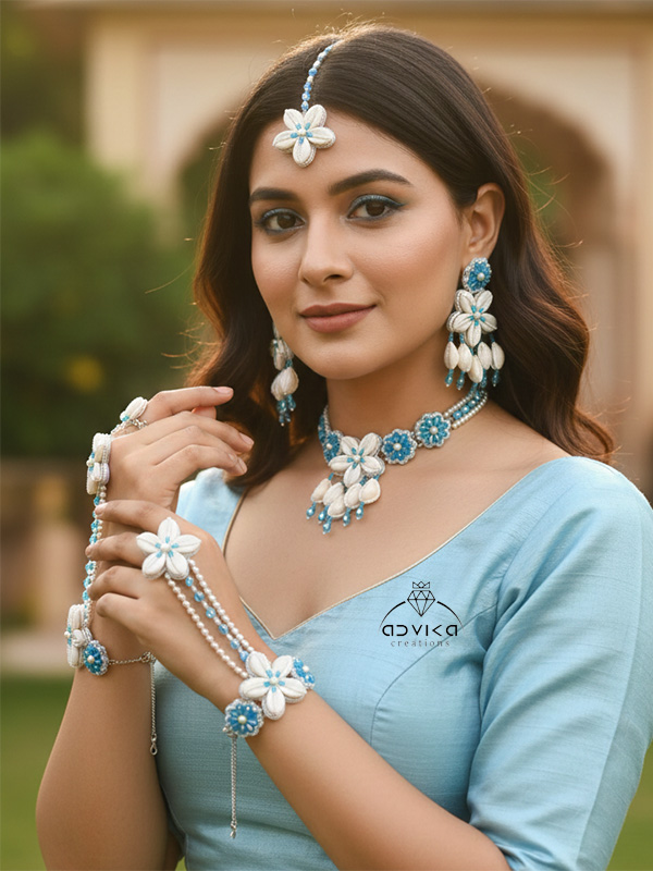 The necklace is delicately layered with sky-blue beads and cowrie shell accents, creating a lightweight yet eye-catching design. Matching earrings, a graceful maangtika, and an elegant hathphool complete the coordinated set, giving a perfectly balanced and festive appearance. Easy to wear and skin-friendly, this jewellery set blends comfort with standout style.