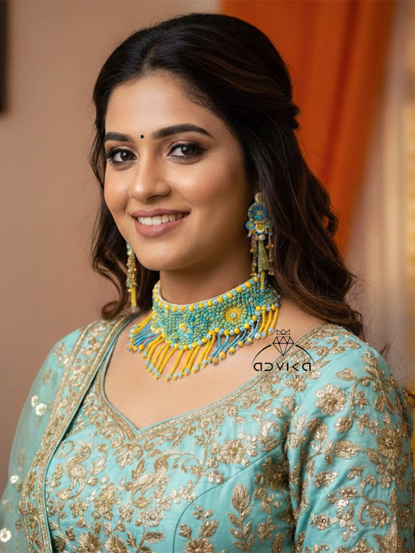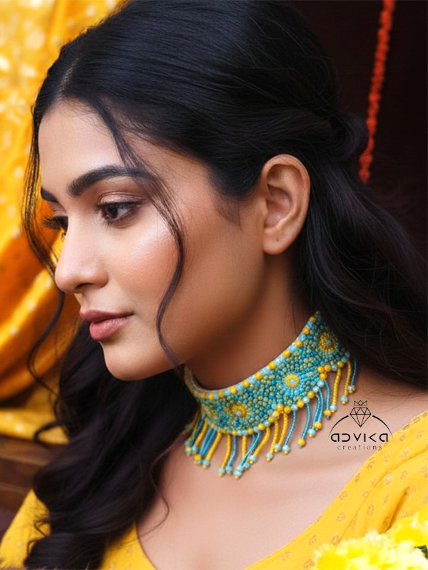 Turquoise & Yellow Beaded Jewelry Set with Kaleeras