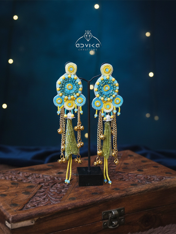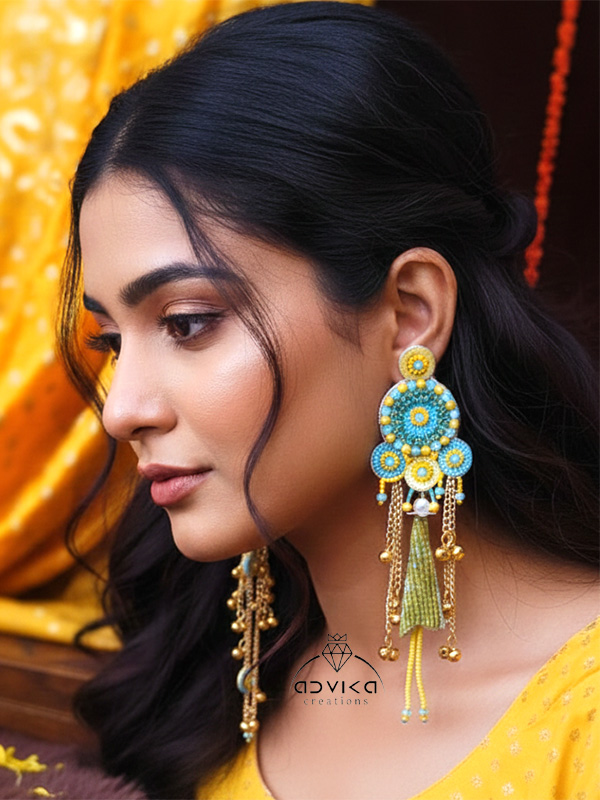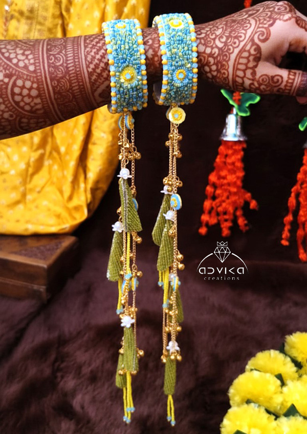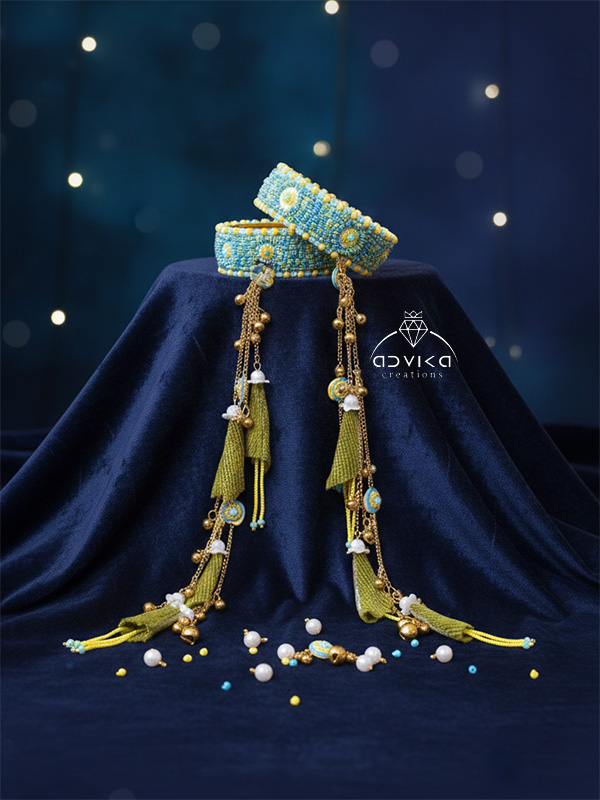 Each piece features intricate bead embroidery and delicate threadwork. The highlight of this set is the matching bangle-bracelets fit 2/4 to 2/10 size, which feature long, cascading golden chains ending in beaded cones and tiny bells, mimicking the elegance of traditional Kaleeras.