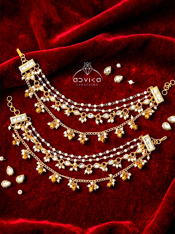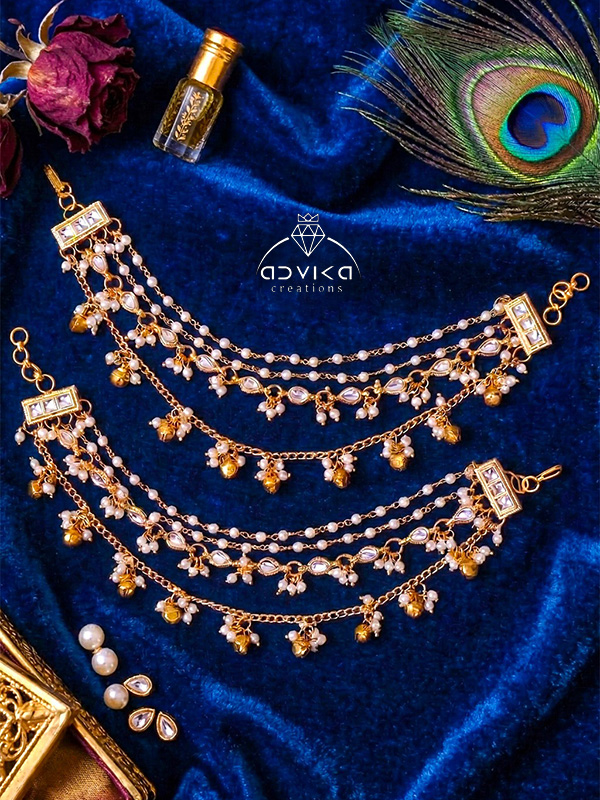 Add a touch of royal elegance to your festive look with this beautifully handcrafted Golden Ear Chain. Designed with intricate kundan stones, this stylish ear chain is further enhanced with delicate golden ghunghroo, elegant connectors, and a graceful pearl link chain that creates a charming traditional appeal. The combination of shimmering kundan and soft pearl accents gives the accessory a rich and sophisticated finish.