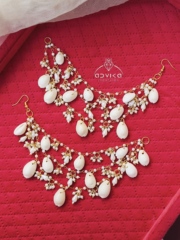 Elevate your bridal or festive look with these Pearl & Cowrie Shell Cascading Ear Chains, an accessory designed to frame the face with grace and movement. These chains serve as functional jewelry, designed to hook into the hair to support the weight of heavy earrings while providing an elegant decorative drape across the ear.