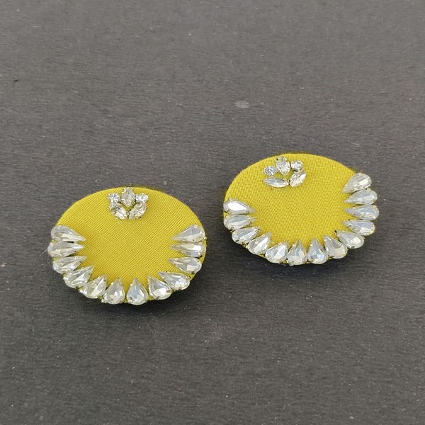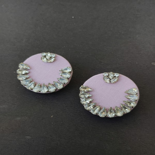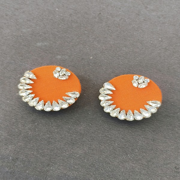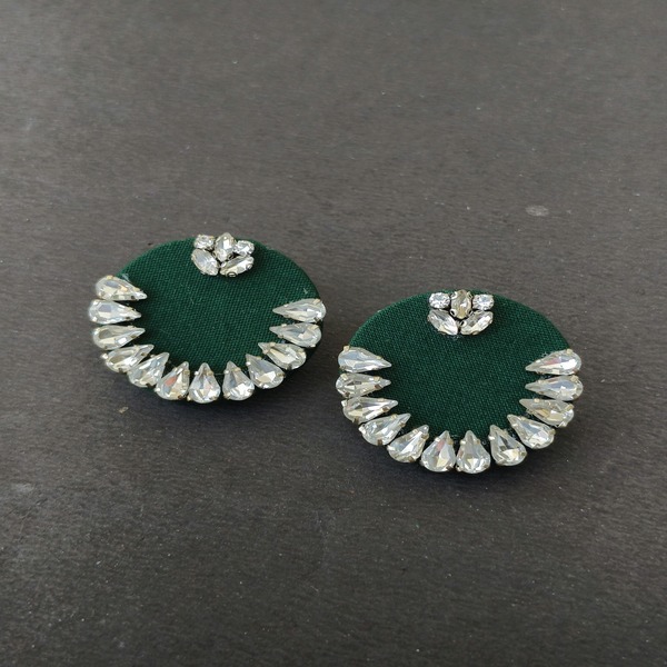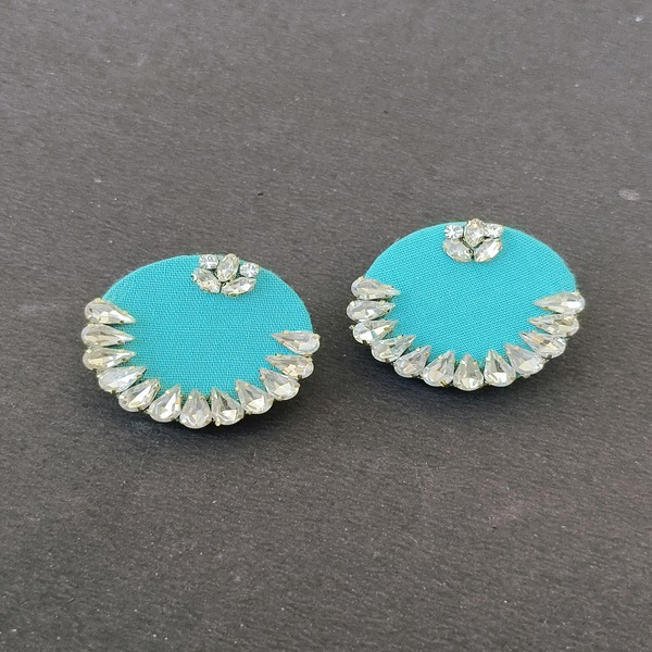 These round-shaped cotton fabric earrings are an elegant blend of rich color and intricate craftsmanship. The vibrant blue fabric forms a perfect circular shape, serving as the base for the stunning stonework embellishment. The stones are carefully arranged, creating a striking contrast against the fabric, adding sparkle and depth to the design.