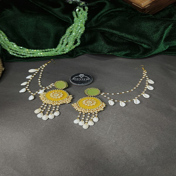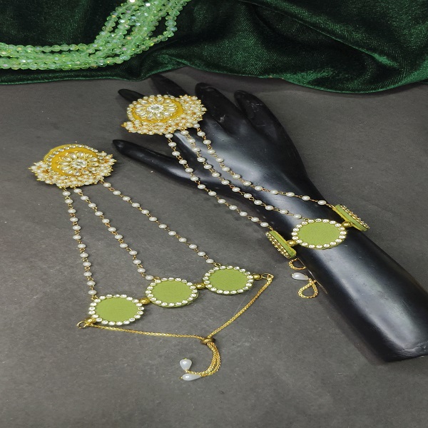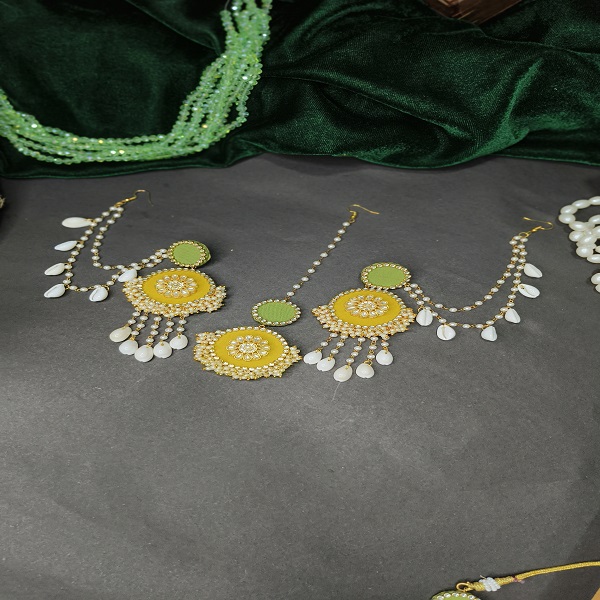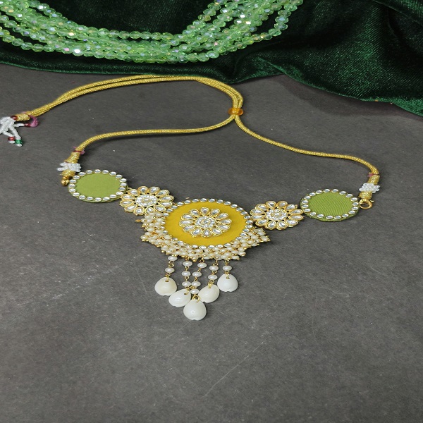 Yellow - parrot green Fabric Handmade Necklace Set for Haldi & Mehndi – Necklace, Earrings, Tikka & haathphool
