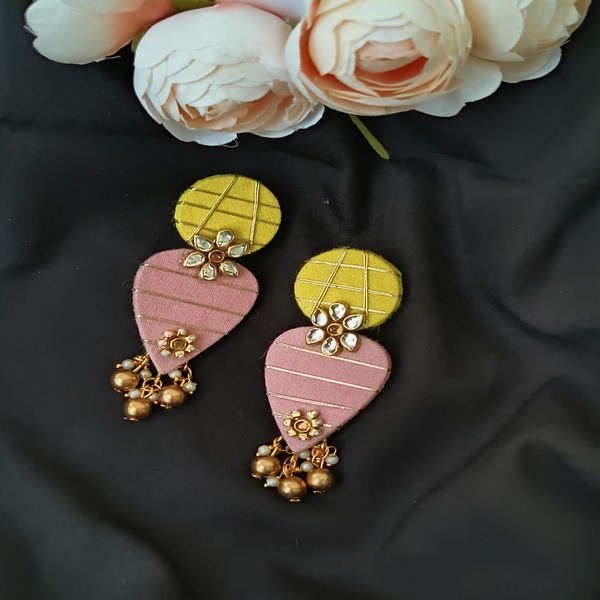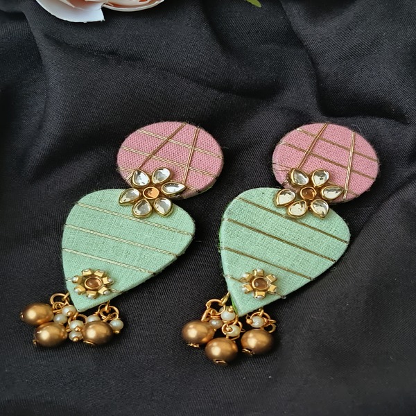 These handmade dual-color fabric earrings feature a beautifully crafted design that combines two complementary hues, offering a vibrant and eye-catching look. The fabric base is carefully stitched to create a smooth, elegant shape, with kundan stones meticulously placed to enhance the traditional charm. Delicate pearls are woven into the design, adding a soft, graceful touch that contrasts perfectly with the bold colors.