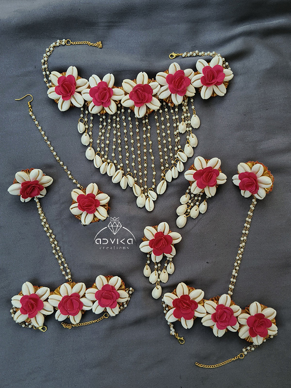 Embrace a bohemian-meets-traditional aesthetic with this Handcrafted Pink & White Floral Shell Jewellery Set. Specifically designed for joyous occasions like Haldi, Mehendi, or Sangeet ceremonies, this set offers a lightweight and comfortable alternative to heavy metallic jewellery.