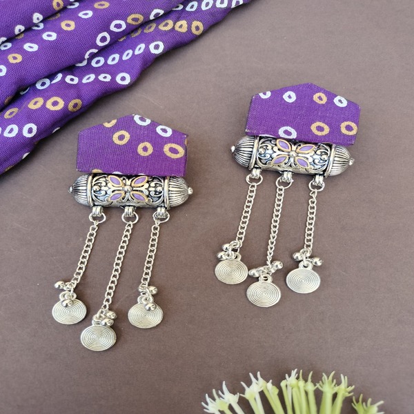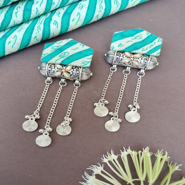 This stunning combo of handmade printed fabric earrings features a blend of traditional and contemporary elements, creating a unique and vibrant accessory. The fabric is beautifully printed, adding an artistic touch with intricate patterns that catch the eye. Hanging delicately from the earrings are silver tabeej (amulets) and ghunghroo (small bells), adding an element of charm and sound to the design. A decorative coin art piece is incorporated, lending a rustic, traditional feel.