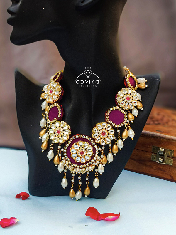 Make a bold yet elegant statement with this beautifully handcrafted Purple Fabric Jewellery Set, designed to add royal charm to traditional and festive ensembles. Wrapped in premium fabric, the set showcases a deep purple tone symbolizing luxury and grace, enhanced with classic Kundan work for a timeless ethnic appeal.