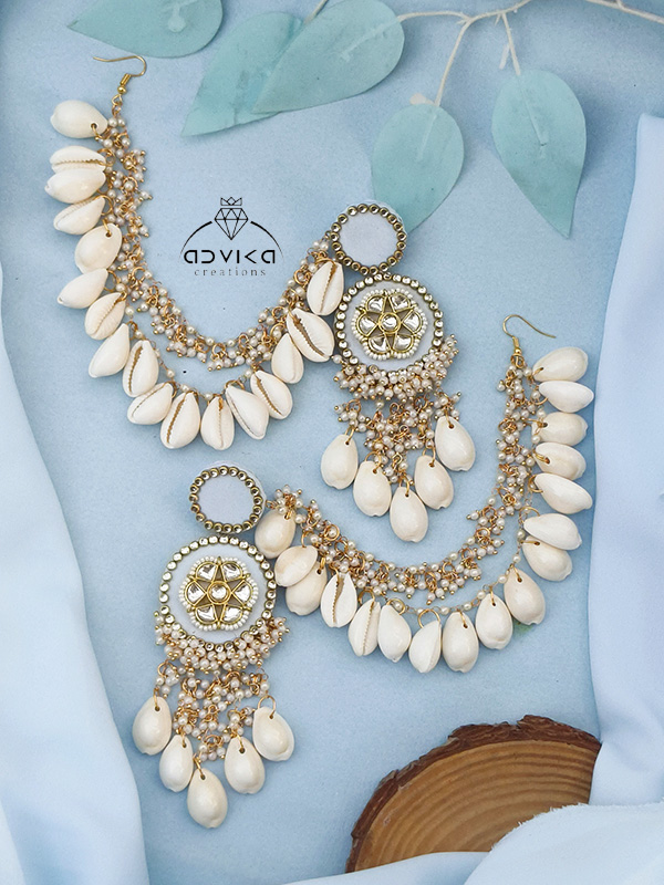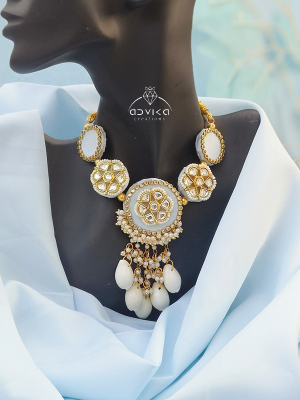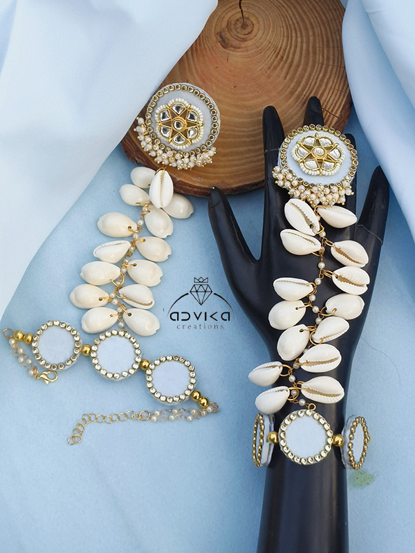 The necklace is crafted using premium fabric in a soothing sky-blue shade, enhanced with cowrie shells that symbolize prosperity and positive energy. Matching earrings, a coordinated maangtika, and an elegant hathphool complete the set, creating a harmonious and eye-catching ensemble. Lightweight and comfortable, this jewellery set is perfect for long celebrations while keeping your look fresh and stylish.