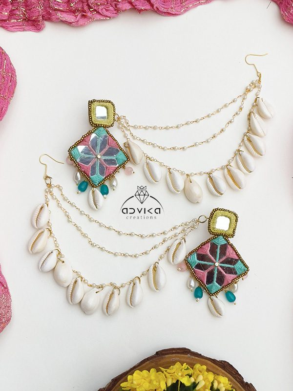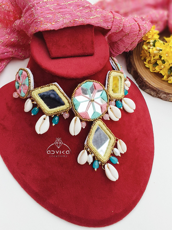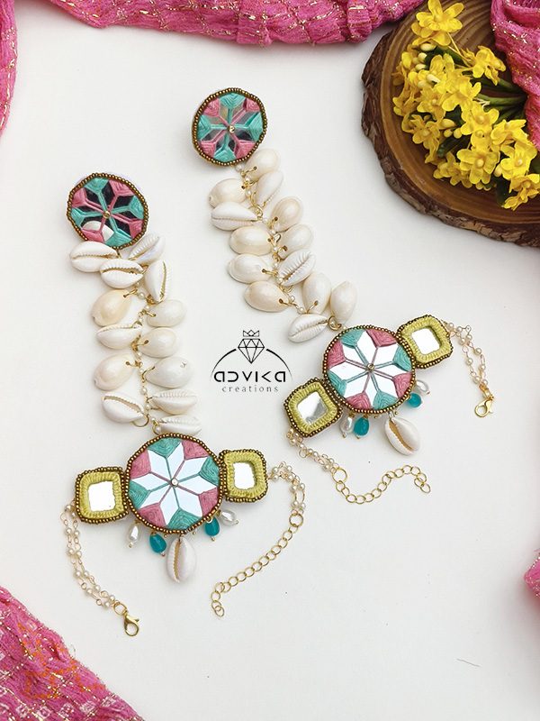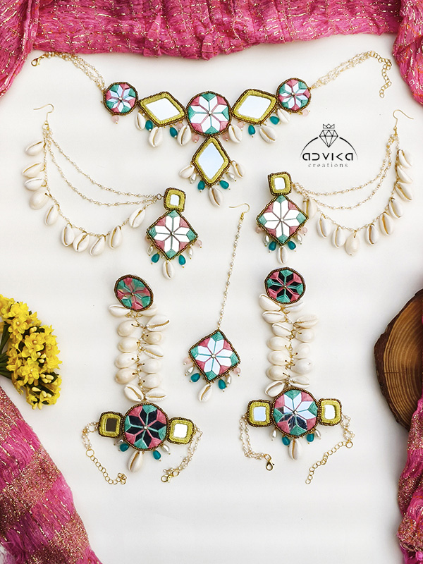 The necklace features sparkling mirror work framed with vibrant multicolor detailing and natural cowrie shells, symbolizing prosperity and positivity. Matching earrings, a coordinated maangtika, and an elegant hathphool complete the set, creating a perfectly balanced and eye-catching ensemble. Lightweight and comfortable, this jewellery set brings together traditional charm and playful elegance.