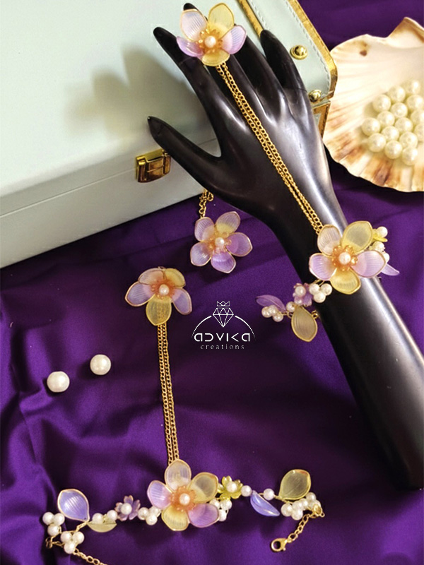 Complete Set: Includes necklace, sahara earrings, maang tikka, and a pair of haathphools.