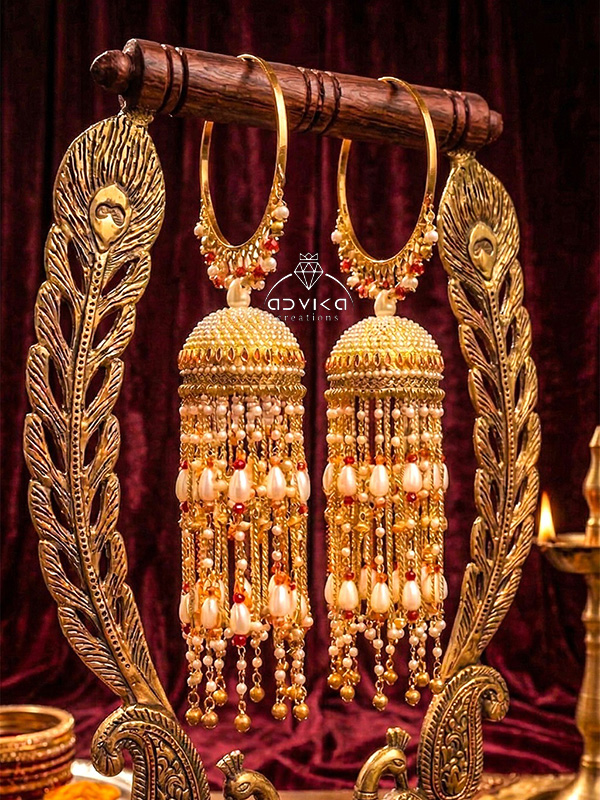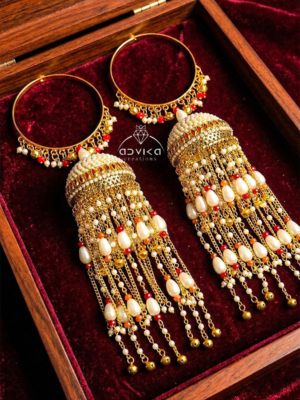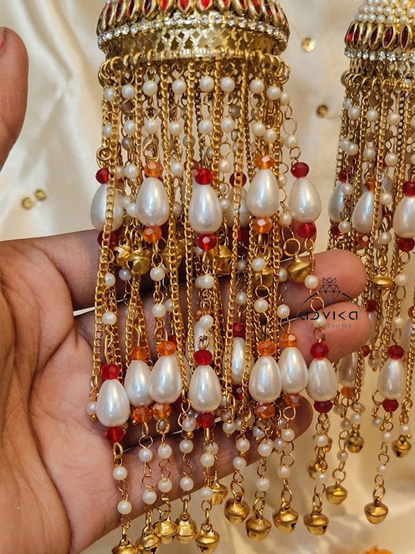 Enhance your bridal elegance with this beautifully handcrafted golden bridal kaleera, designed to add a vibrant and traditional charm to your wedding look. Adorned with crystal beads, and drop pearl beads this kaleera brings a pop of color while maintaining a rich and royal appeal. The delicate pearl link chains add softness and grace, perfectly balanced with pearl chains for ethnic touch.