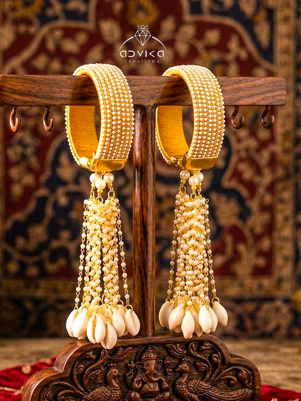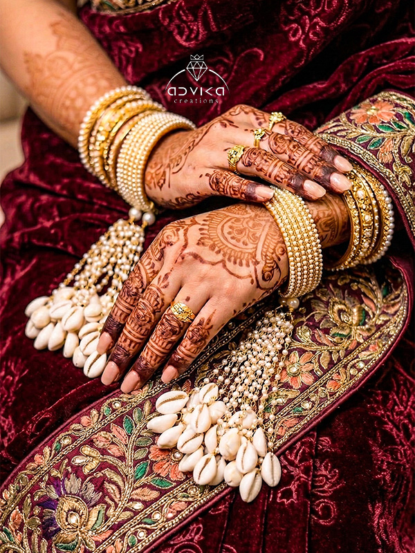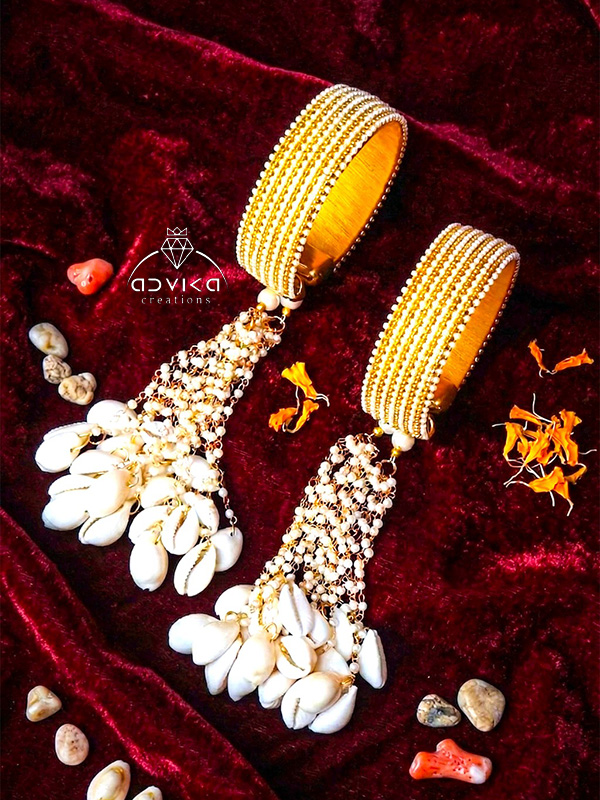 A touch of coastal charm comes through the carefully added cowrie shells, giving the kaleera a unique boho-ethnic feel perfect for Haldi, Mehendi, Sangeet, and wedding day functions.
