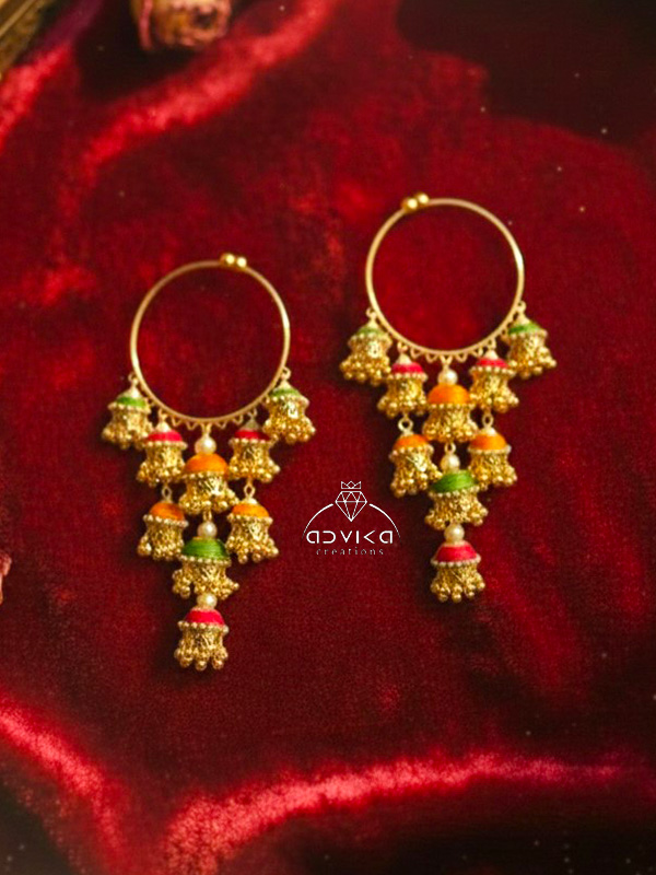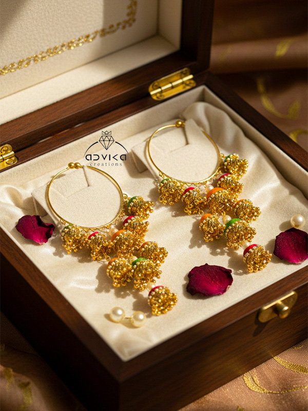 Add a royal and vibrant touch to your bridal look with this stunning multicolor jhumka kaleera in a rich golden finish. Designed in a traditional jhumka pattern, this kaleera features beautifully arranged colors, pearls, and dangling elements that create a graceful movement with every step.