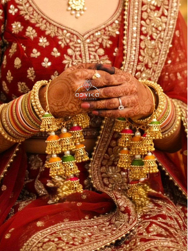 The golden base enhances the festive charm, while the multicolor accents make it perfect for matching with a variety of bridal outfits. Lightweight yet eye-catching, this kaleera is ideal for brides who want a blend of tradition and modern elegance.