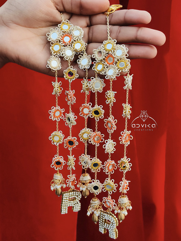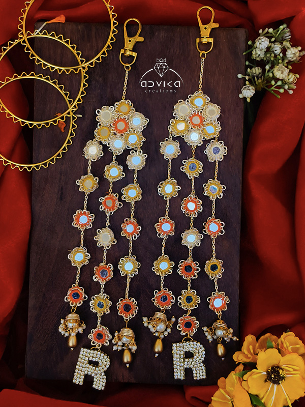 The highlight of this set is the sparkling crystal monogram, which adds a meaningful touch to the bridal ensemble. Each tier of the kaleera is adorned with vibrant orange threadwork and reflective mirrors, creating a high-impact look perfect for Mehendi, Sangeet, or the wedding ceremony. Whether you are looking for a unique photo accessory or a traditional piece with a modern twist, these personalized kaleeras are designed to be as special as your celebration.