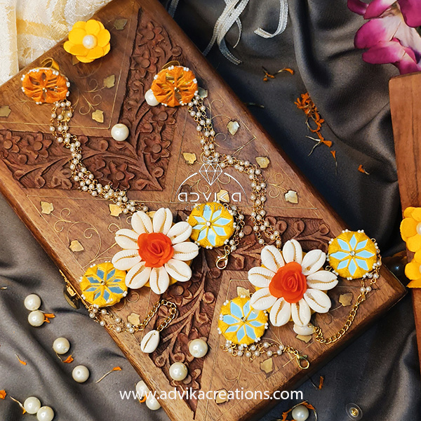 This unique combination of vibrant colors, mirror detailing, and natural cowrie shells embodies a festive yet earthy aesthetic. Perfect for haldi, mehendi, beach parties, or as thoughtful return gifts.