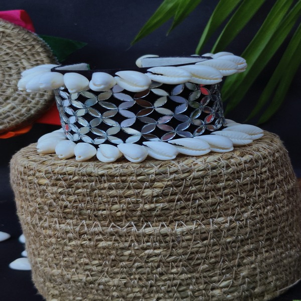 Make a statement with this exquisite handmade handcuff, adorned with cowrie shells, mirrors, and intricate embellishments. Its unique blend of traditional elements and contemporary design makes it a perfect accessory to enhance your outfit for any occasion.