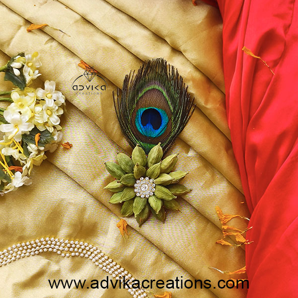 The Ilaichi flower brooch with stones and a peacock feather is a sophisticated and elegant accessory. This intricate design features delicate Ilaichi flower petals, adorned with sparkling stones, complemented by a vibrant peacock feather. It’s a perfect blend of tradition and beauty, ideal for adding a touch of grace to any outfit.