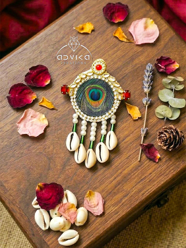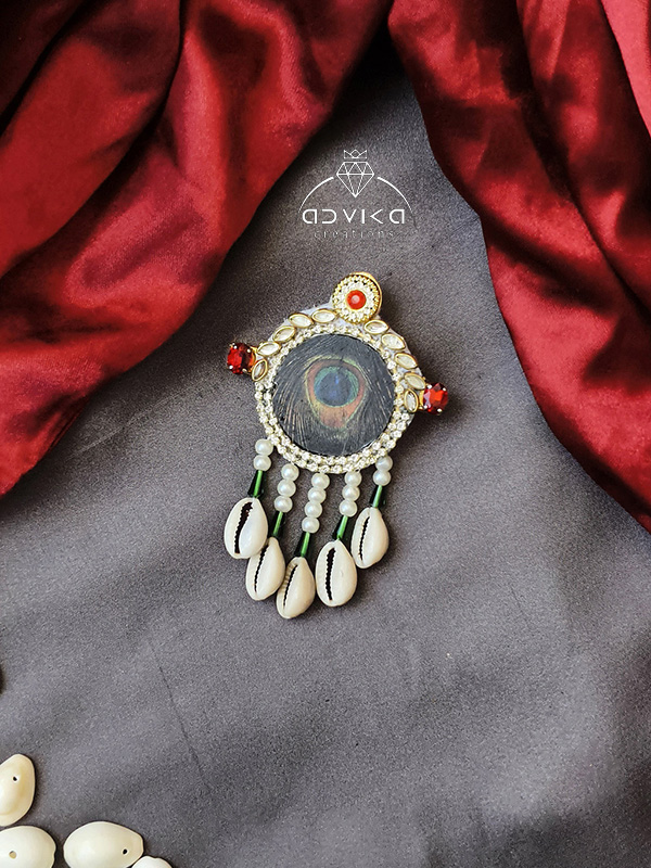 This beautiful hair backpin features an elegant Morpankh (peacock feather) motif design, handcrafted to add a royal and traditional touch to your hairstyle. The design is decorated with sparkling kundan stones, delicate pearl detailing, and natural cowrie shells, creating a unique blend of ethnic charm and modern elegance. The graceful peacock feather pattern symbolizes beauty and grace, making it perfect for festive and wedding occasions.