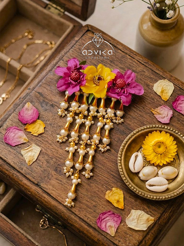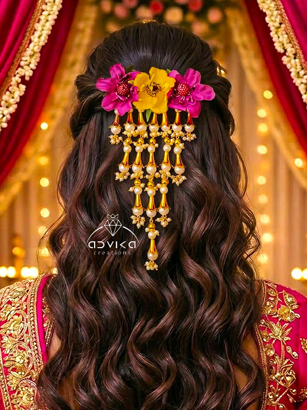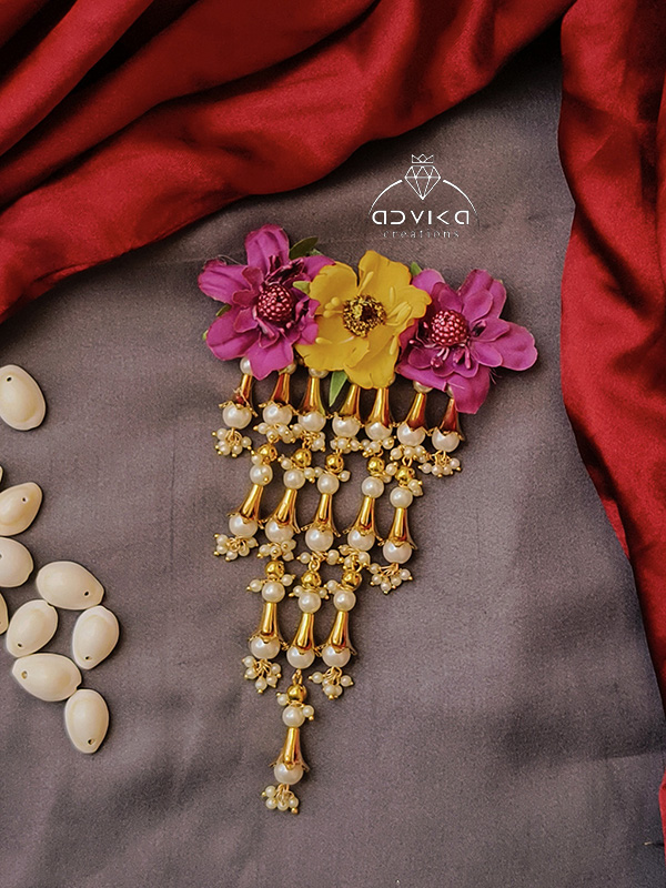 Add a charming floral touch to your hairstyle with this beautifully handcrafted hair backpin. Designed with vibrant pink and yellow flowers, this elegant accessory features delicate pearl detailing and a rich golden finish that enhances its traditional appeal. The cascading pearl and golden bead drops create a graceful movement, making it a perfect statement piece for festive and bridal looks.