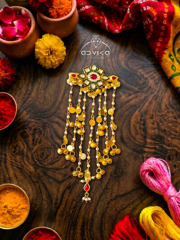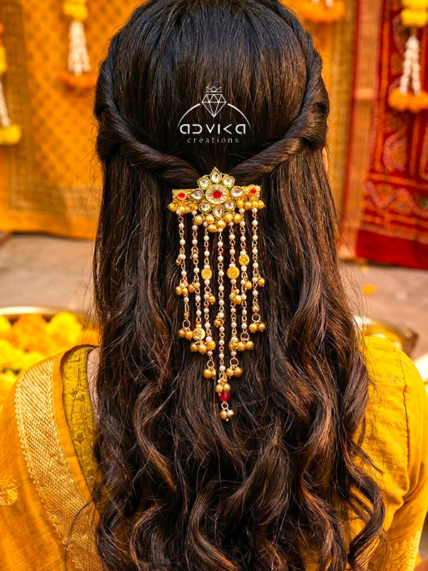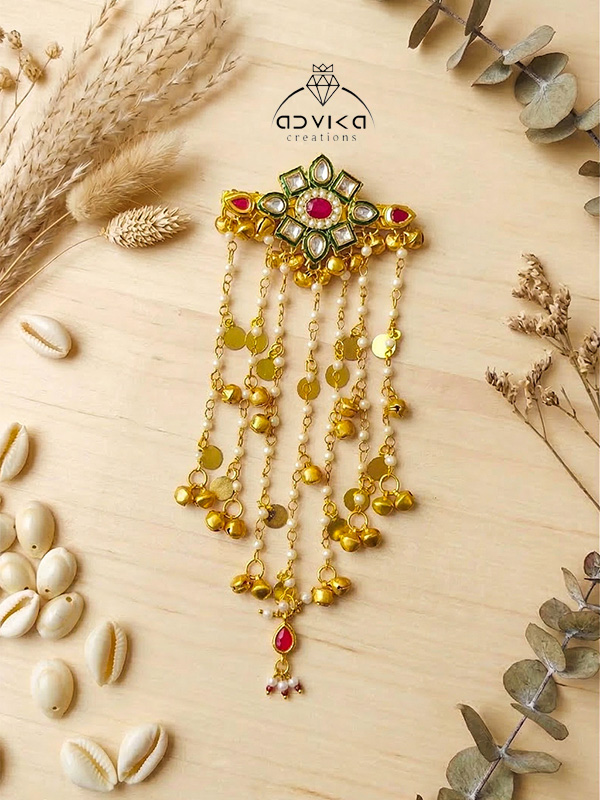 Add a touch of regal charm to your hairstyle with this exquisitely crafted hair backpin. Featuring a delicate kundan charm at its center, this piece is adorned with shimmering golden chains, tiny golden beads, and intricately designed charms that cascade gracefully, creating a stunning layered effect. Perfect for bridal hairstyles, festive occasions, or traditional events, this hair accessory instantly elevates your look with a blend of elegance and opulence. Its lightweight design ensures comfort without compromising style, making it an essential piece for anyone who loves intricate, ethnic-inspired accessories.