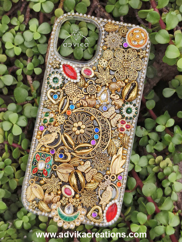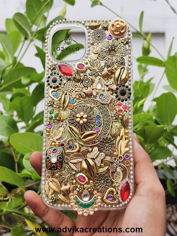 Customised Design: Tailored mobile covers with handcrafted embellishments Decorative Elements: Embellished with multicolor Kundan charms & golden metal charms Stylish & Protective: Combines elegant decoration with durable phone protection Perfect for All Occasions: Great accessory for weddings, festivals, or everyday glam Compatible with Most Models: Available for popular phone models (customizable on request) Ideal Gift Option: Unique handcrafted cover for birthdays, weddings, or festive gifting
