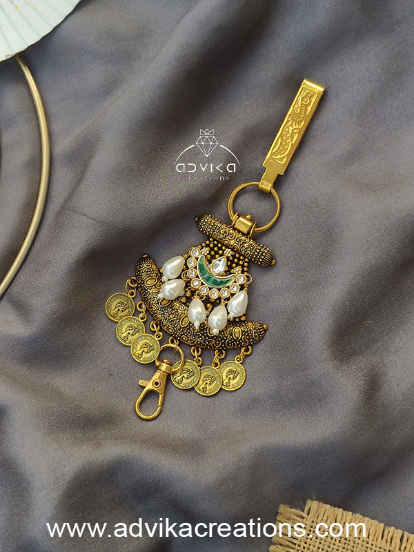 This exquisite mobile hanging satka is delicately handcrafted using golden metal charms, shimmering kundan Charms, and lustrous pearl beads. The elegant combination creates a rich, festive look that complements both traditional and fusion outfits. Lightweight yet sturdy, it can be easily attached to any mobile cover, making your phone look stylish while adding a graceful accessory touch.