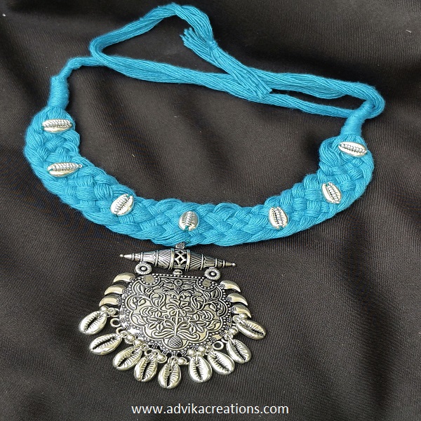 Elevate your style with our Sky Blue Thread Jewelry with Oxidized Pendant, a perfect blend of serenity and charm. The soft sky-blue threadwork complements the intricate design of the oxidized pendant, creating a stunning accessory that exudes elegance and grace.