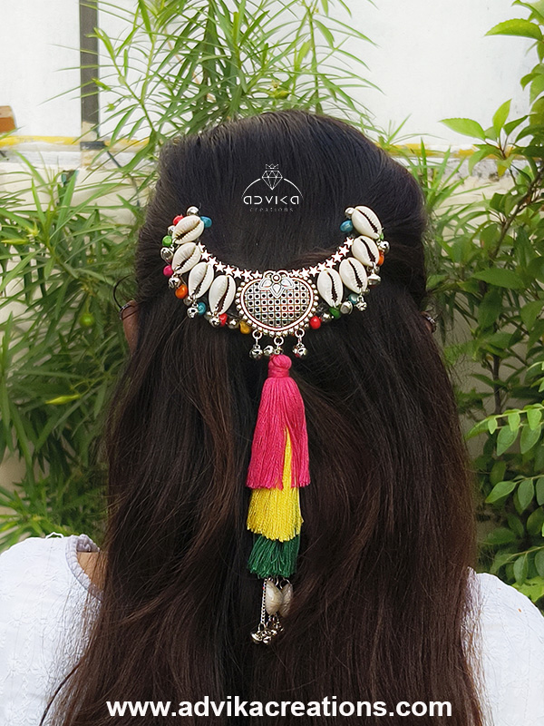Design: Half-moon shape with vibrant and intricate embellishments Decorations: Silver charm, ghungroo, multicolor wooden beads, tassels, and cowrie shell Handcrafted: Each piece is made with care for a unique touch Occasion: Ideal for Navratri, Garba nights, weddings, haldi, mehendi, and festive events Comfortable Hold: Sturdy clip ensures it stays in place during dance and movement