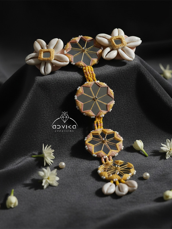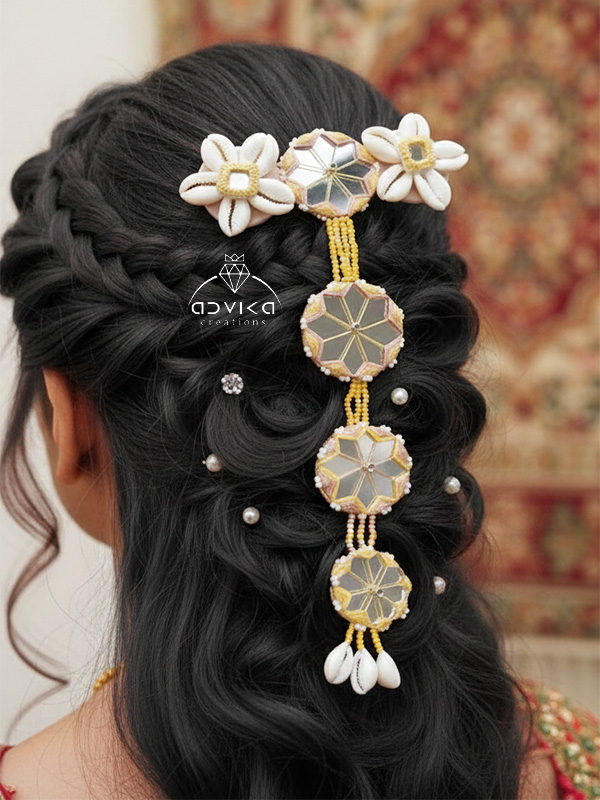 Discover the allure of timeless elegance with the Radiant Reflections Mirror Work Hair Clip. This stunning accessory features intricate mirror work, reflecting light with every movement and adding a touch of dazzling sophistication to any hairstyle.