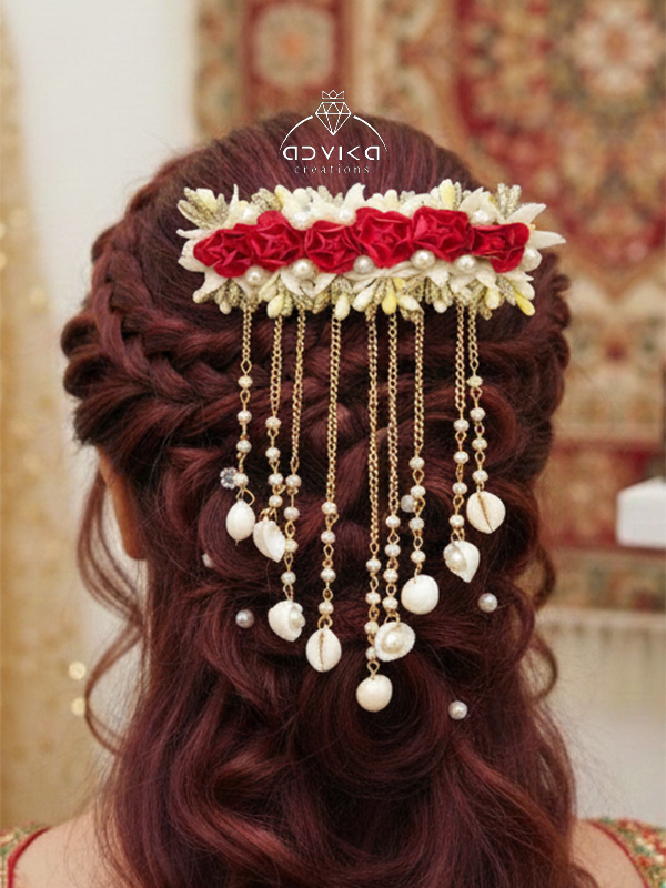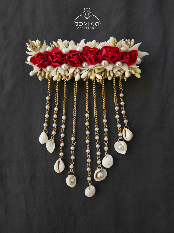 Decorated with pearl beads, kaudi shells, artificial flowers, and pollen
