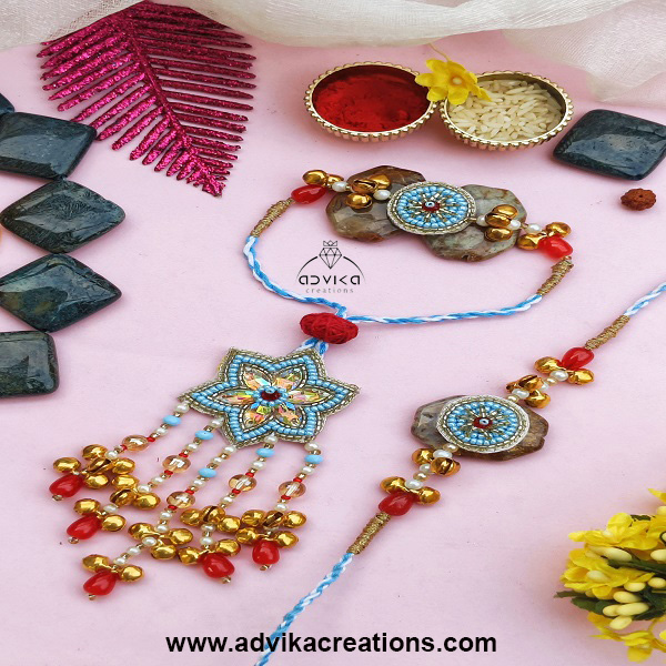Lumba Rakhi with Hanging Patch: Designed with a beaded flower patch for Bhabhi for a traditional look
