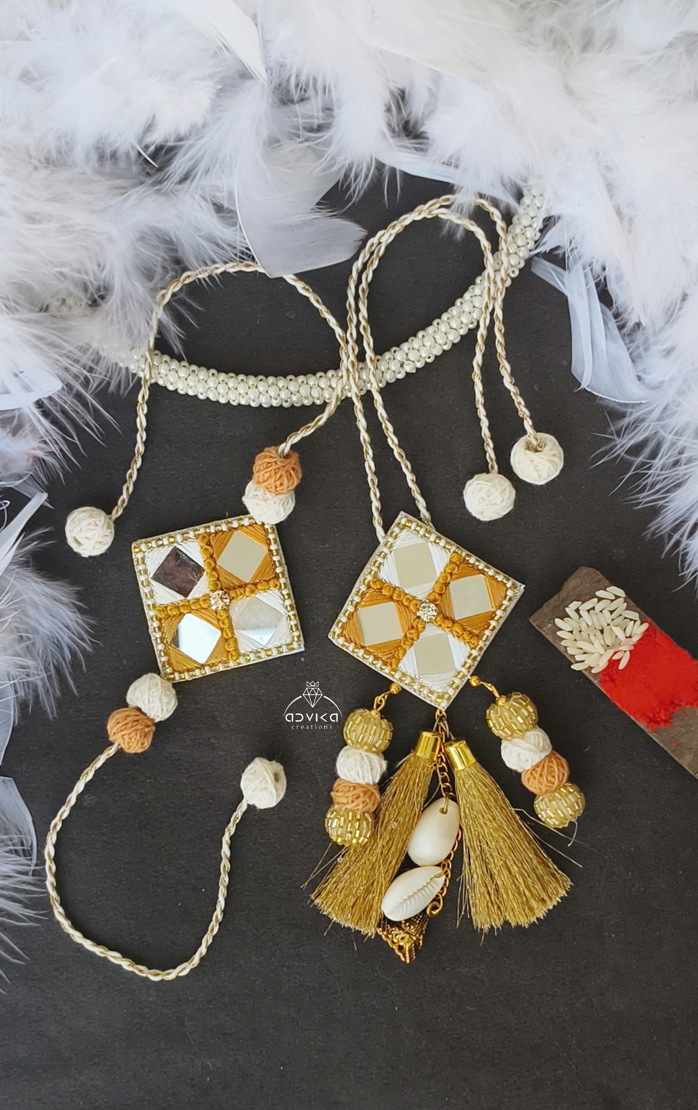 Decorated with golden tassels, kaudi shells, and coordinated beads