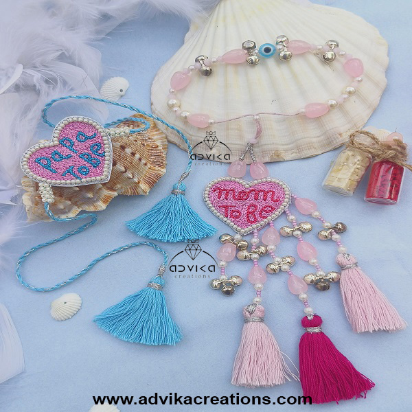 Unique Concept: Specially designed rakhi set for expecting Bhaiya and Bhabhi with one sided "Mom-to-Be" and "Dad-to-Be" charms