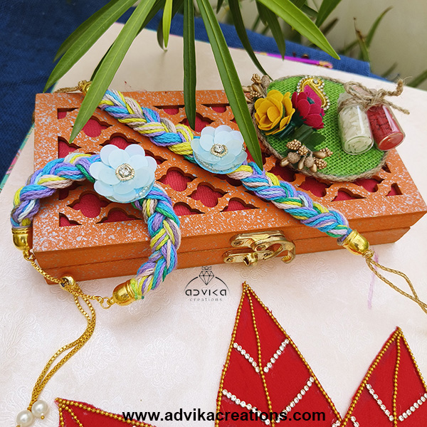 Bhaiya-Bhabhi Rakhi Set: Includes one thread rakhi for Bhai and one bracelet rakhi for Bhabhi with roli-chawal platter
