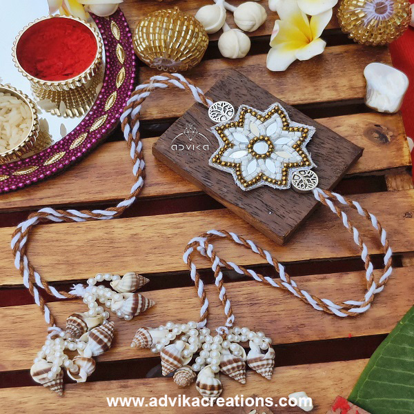 Unique Design: Features a mirror flower centerpiece surrounded by pearls and shankh shells