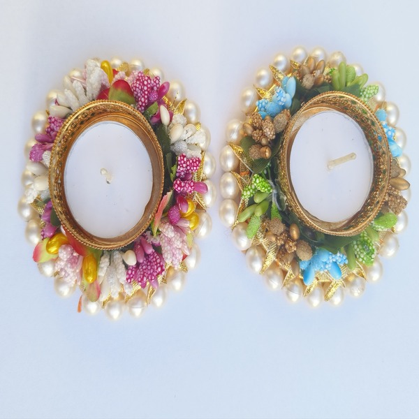 These elegant tealight holder is handcrafted with floral designs and shimmering embellishments, making it an ideal choice for festive décor. Whether for Diwali, weddings, or daily décor, it adds a touch of festive charm to your space.