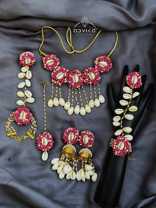 1 chokar, 1 pair earrings, 1 pair hathphool, 1 maangtika