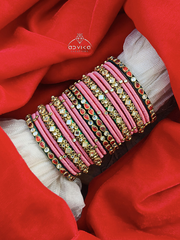 Add a soft yet regal touch to your ethnic look with these beautifully handcrafted baby pink and green silk thread bangles, elegantly adorned with sparkling kundan stones. The soothing pastel pink paired with refreshing green creates a graceful contrast, making these bangles perfect for festive and celebratory occasions.