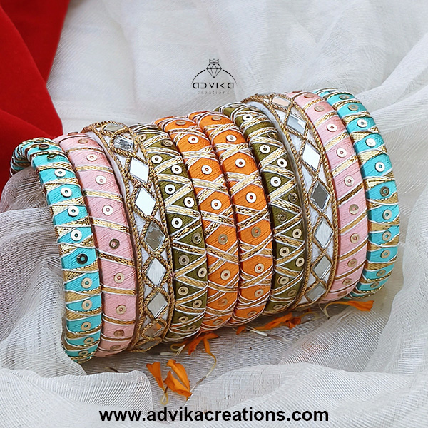 Set of 10 pieces Handcrafted silk thread bangles Pastel colors for a soft, elegant look Embellished with golden gota lace, sequins & zari Lightweight and skin-friendly Ideal for festive wear, wedding functions, haldi/mehendi, or gifting