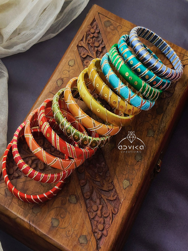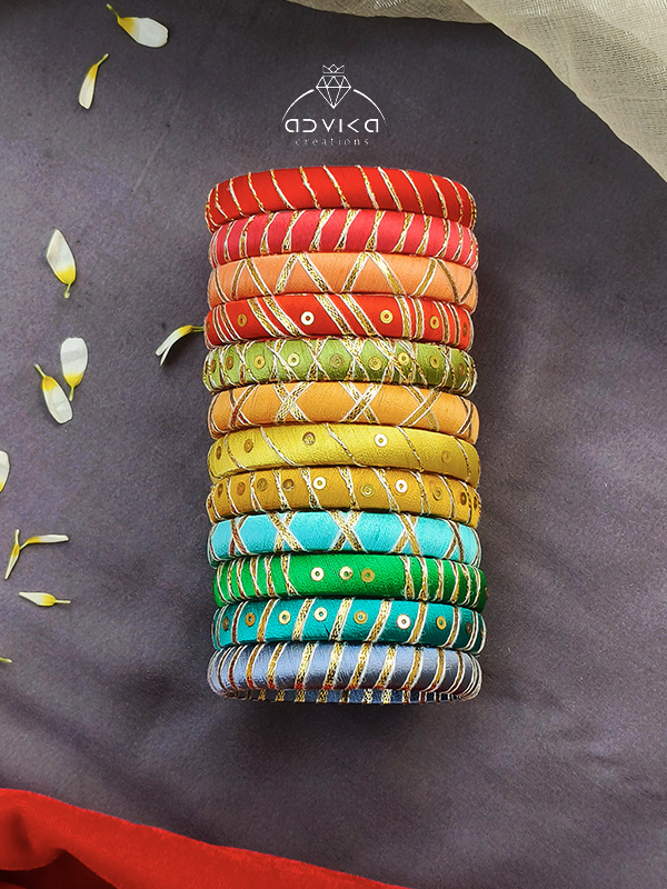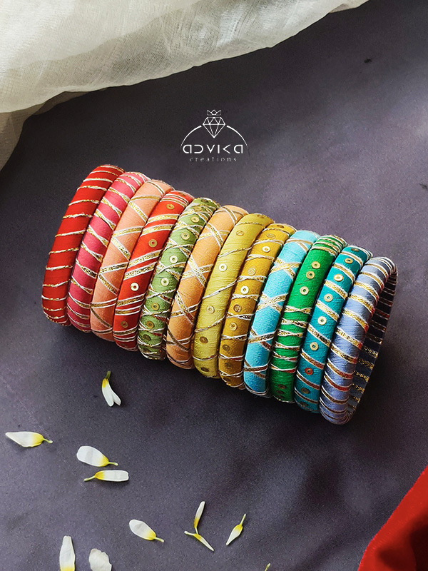 Each bangle is finished with a soft, lustrous silk sheen that provides a more sophisticated look than standard glass or plastic bangles. The golden gota lace and sequin work add just enough sparkle to make them suitable for festive occasions like Mehendi ceremonies, Haldi functions, or casual family gatherings. Lightweight and comfortable, these bangles offer a noiseless, elegant alternative to metal jewelry while making a bold, cheerful statement.