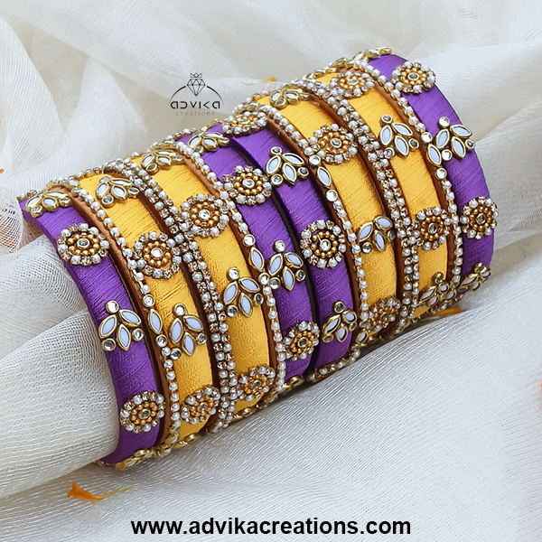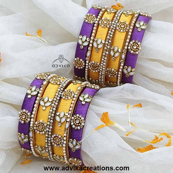 Set of 14 pieces Color Combination: Vibrant Yellow and Royal Purple Material: High-quality silk thread wrapped base Embellishments: Ceramic kundan, pearl chain, and stone chain Design: Traditional yet contemporary handcrafted design Occasions: Ideal for weddings, festivals, haldi-mehendi, and party wear Comfort Fit: Lightweight and easy to wear for long hours