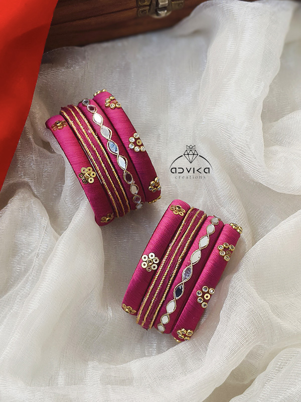 Elevate your ethnic ensemble with this Magenta Silk Thread Bangle Set, a perfect fusion of traditional Indian craftsmanship and contemporary style. Each piece is hand-wrapped in lustrous silk thread, giving the jewelry a soft, luxurious sheen that glows under festive lighting.
