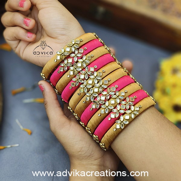 Add a pop of elegance to your festive or wedding look with this exquisite bangle set. These bangles are meticulously wrapped Yellow And pink silk threads, creating a stunning dual-tone contrast that instantly catches the eye. Each bangle is adorned with sparkling Kundan stones, delicately placed to enhance the richness and traditional charm of the design.