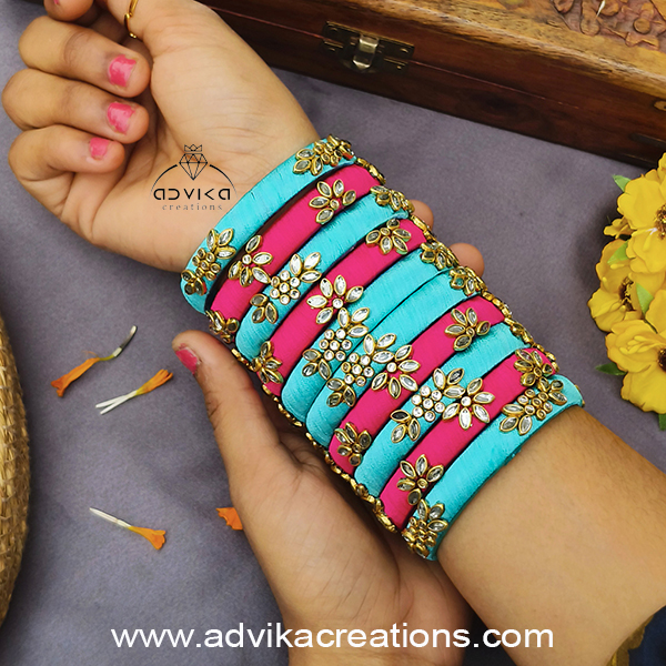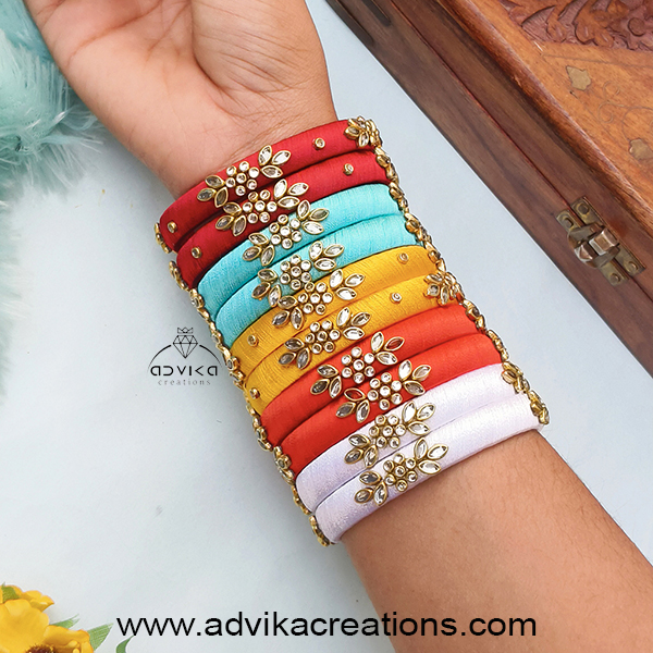 Add a pop of elegance to your festive or wedding look with this exquisite bangle set. These bangles are meticulously wrapped in soft multicolor silk threads, creating a stunning dual-tone contrast that instantly catches the eye. Each bangle is adorned with sparkling Kundan stones, delicately placed to enhance the richness and traditional charm of the design.
