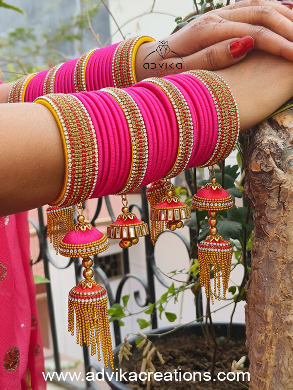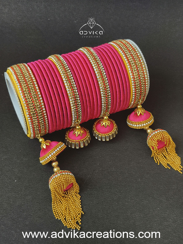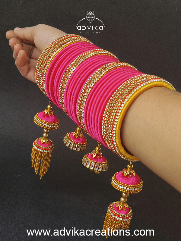 This exquisite bridal pink silk thread bangle set is a perfect blend of traditional elegance and handcrafted artistry, designed especially for brides and festive occasions. Wrapped neatly with rich pink silk thread, these bangles symbolize love, prosperity, and bridal grace.
